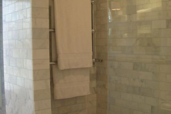 White Carrara marble stone brick joint pattern, white tri-view linen cabinet, nickel finish fixtures, counter vessel sink, wall mounted faucets