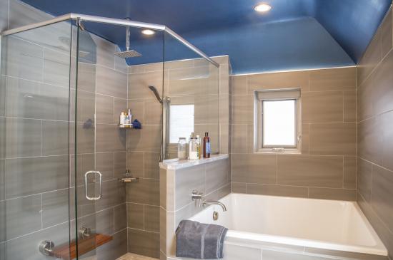 Japanese style soaking tub, raw concrete walls, carriage black stain maple cabinet, hand painted wall murals, large formatted porcelain tiles, metallic painted blue ceiling