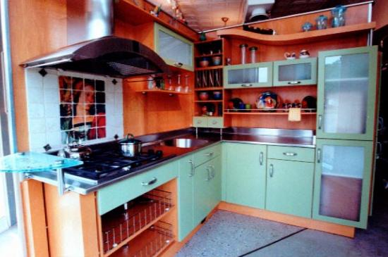 Compact European Vignette style kitchen, pale olive-green doors, butternut maple wood cabinet cases and back panels, custom curved wine shelf, stainless steel counter